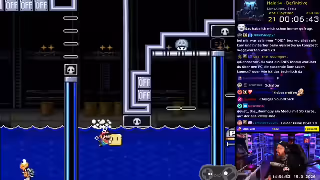 03:20:30Der Streamer stößt auf ein besonders schwieriges Level im Spiel, das als einer der härtesten Momente des Hacks beschrieben wird. Es erfordert präzise Sprünge, Damage-Boosts und komplexe Manöver wie Low Swims, was zu langer Spielzeit und Nervosität führt. Parallel dazu unterhält er sich mit der Community über diverse Themen wie Jubiläen, den kommenden Film und diskutiert die Schwierigkeit des Levels.