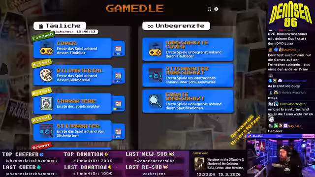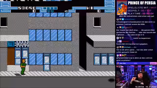 03:56:46Nach der Brillenreparatur startet das Segment "Wonne oder Tonne". Der Streamer erstellt eine Liste mit Titeln für NES, Gameboy und andere Systeme. Zufällig wird "Prince of Persia" für das NES ausgewählt. Er beginnt das Spiel, gibt einen ersten Eindruck über die Controls und die Grafik und stellt fest, dass die Kämpfe im Spiel langweilig sind, was den Genuss trübt.