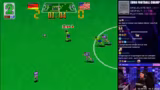 05:00:40Das Zufallsspiel Euro Football Champ beginnt. Der Streamer erkundet die Menüs und die Steuerung, die sich auf wenige Buttons beschränkt. Er startet ein Spiel Deutschland gegen USA und beschreibt das Spielgeschehen. Die Steuerung erweist sich als schwierig, da man nur Flanke oder Pass schießen kann und keine echte Kontrolle über die Spieler hat, was zu frustrierenden Momenten führt.