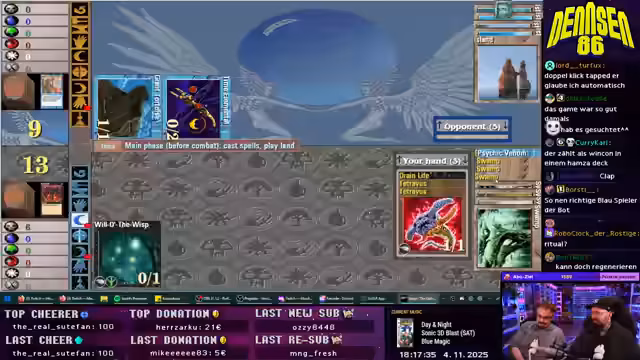 01:56:56Der Stream beginnt mit einem intensiven Magic-Duell, in dem der Spieler strategische Entscheidungen trifft. Zunächst geht es darum, Mana-Pools durch das Ausspielen von Wäldern und Plains aufzubauen. Schlüsselmomente beinhalten den Einsatz von Fänen wie 'Unholy Strength' und 'Grizzlybeeren', wobei der Spieler oft unsicher über die genauen Effekte ist. Ein entscheidender Faktor ist die 'Wall of Fog', die Schutz bietet, während der Gegner mit Schadensquellen wie 'Schlammkanone' Druck aufbaut. Spielerische Entscheidungen, wie das Positionieren von Kreaturen hinter der Mauer und der Einsatz von Karten wie 'göttliche Verwandlung', prägen das Gameplay.