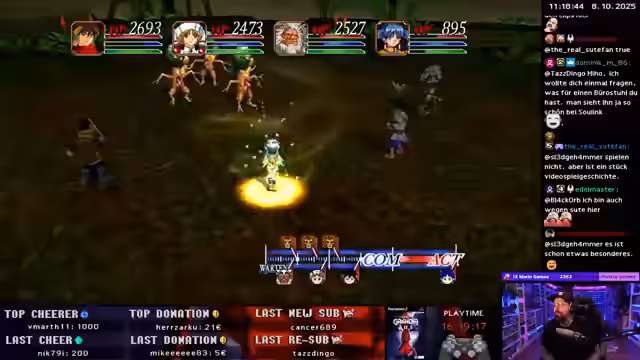 01:23:46Der Streamer erkundet die tiefen Gameplay-Mechaniken von Grandia 2. Er ist begeistert von Ryudos Fähigkeit 'Dragon Slash', die vier einzelne Angriffe ausführt und extrem stark ist. Er entscheidet, den Skill mit 'Special Coins' zu verbessern und testet ihn aus, was zu sehr hohem Schaden führt. Beim Ausrüsten seiner Charaktere stellt er strategische Entscheidungen zur Optimierung der Angriffs- und Verteidigungswerte seiner Gruppe. Seine Begeisterung für das Spiel ist nach 17 Spielstunden weiterhin sehr hoch, obwohl er sich auch über die teuren Manakosten von speziellen Fähigkeiten ärgert.