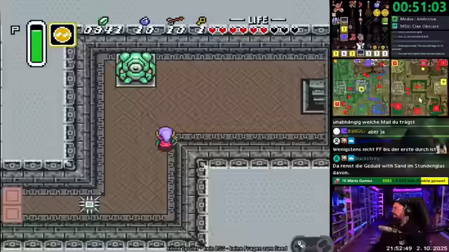 04:51:11Das Wegparrieren von Gegnern wird als einfach dargestellt, wobei eine geringe Menge Geist bei erlittenem Schaden gewonnen wird. Es wird die Möglichkeit erwähnt, eine neue Technik zu erlernen und ein Waffenkit als Belohnung zu erhalten. Die Frage, ob man sich dorthin porten kann, wird aufgeworfen. Das Besiegen eines feindlichen Anführers wird als Ziel identifiziert. Stealth-Mechaniken spielen eine Rolle, und es wird ein Hissen-Nest vermutet. Die Zeit wird knapp, und es herrscht Eile, bestimmte Ziele zu erreichen. Die Schwierigkeit des Spiels wird betont, insbesondere die präzisen Zeitfenster. Es wird die Hoffnung auf automatisches Speichern geäußert. Das Spiel wird als herausragend bewertet. Es folgt die Vorbereitung auf ein Zelda-Race, inklusive der Anpassung von Einstellungen und dem Einpacken einer Vanilla-Rom. Ein Pallet Shuffle wird ausprobiert, und es wird ein kurzer Toilettenbesuch eingelegt, bevor das Race beginnt. Ein Hack wird entdeckt, was große Freude auslöst. Es folgt eine fiktive Szene, in der getankt wird und der Protagonist beschuldigt wird, etwas gestohlen zu haben. Das Gehirn wird als hypnotisiert beschrieben.