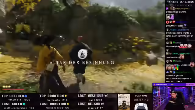 01:15:13Es wird ein Haus eines Verräters an Fürst Saito entdeckt, dessen Familie für seinen Verrat bezahlt hat. Man interagiert mit den Ainu, den Ureinwohnern des Landes, und erfährt von Unruhen in der Gegend. Es wird ein Lied gespielt, das an Pikata Kamui, die Göttin des Windes, erinnert. Man erhält Quests von den Ainu und kann mit ihnen handeln. Es wird ein Raise für den Abend angekündigt und auf den Bonus-Stream am morgigen Feiertag hingewiesen. Es wird überlegt, ob man anstelle von Ghost of Yotei die Mario-Spiele spielen soll, um die Zuschauer nicht zu spoilern. Es wird ein Lager errichtet und mit dem Touchpad eine Zunderkugel entzündet. Man reitet über die Wiese und ist von der Inszenierung, dem Sound und der Grafik des Spiels begeistert. Es wird ein Lager des verlorenen Mönchs entdeckt und man trifft auf einen Mönch, der einem bei der Suche Gesellschaft leistet. Die Altäre der Besinnung werden als Orte der Reflexion dargestellt, die von Ronin besucht werden sollen, um ihre Perspektive zu ändern. Es werden Techniken zum Erlernen ausgewählt, darunter Waffenwerfen, Pferdestärken und der vernichtende Angriff aus der Scheide. Es wird ein Altar der Besinnung gefunden, an dem man die Zeit verlangsamen und einen Gegenangriff ausführen kann. Es wird die Sorte Männer erwähnt, die dringend innehalten sollte, und man erhält Dank für die Hilfe.