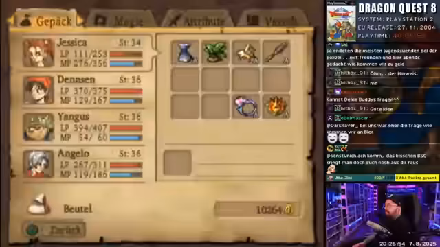 05:15:17Der Streamer spielt Dragon Quest 8 und kämpft gegen einen Verzweiflungsangriff, der ihm viel Schaden zufügt. Er ist in einer Stadt, farmt Geld, da er wenig Gold besitzt, und versucht, seine Monster-Mannschaft zu verbessern. Dabei diskutiert er über die Stärken verschiedener Waffen wie Äxte, Keulen und Sensen für seine Charaktere und sucht nach Orten, um Metallschleime für mehr Gold zu farmen.