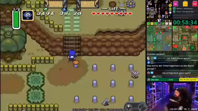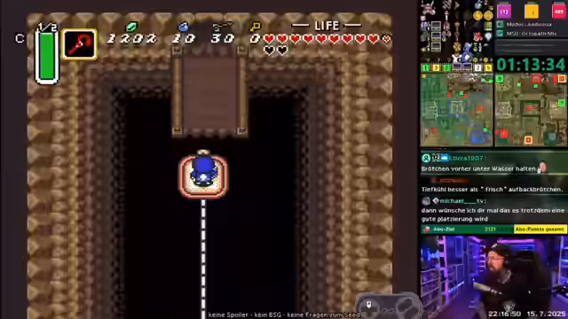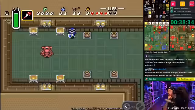 00:00:02Der Stream beginnt mit wiederkehrenden Internetproblemen, die den Stream gefährden. Der Streamer bemängelt, dass das Internet zwar neun Tage lang stabil war, aber genau beim 24-Stunden-Stream ausfiel und er die Session vorerst abbricht. Gleichzeitig stellt er fest, dass sein aktueller Gegenstand, der Bogen, im Tracker nicht angezeigt wird, was zu einer Verwirrung führt. Er erwähnt zudem, dass Kristalle und Bomben im Spiel sichtbar sind, was aber für den aktuellen Spielverlauf irrelevant ist.
