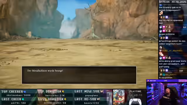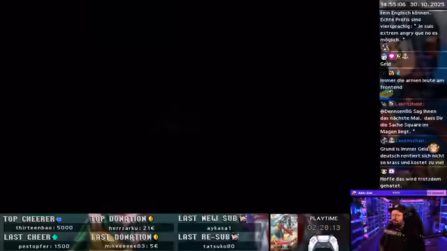 07:30:53Im letzten Match werden Ressourcen verschwendet und Chancen nicht genutzt, was zu einer klaren Niederlage führt. Nach dem Street Fighter Gameplay wechselt der Streamer zu Dragon Quest 1+2 HD Remaster. Er wählt den Slime als Charakter, ist aber mit dem Sprite unzufahren, da er qualitativ schlecht ist. Er kündigt ein Halloween-Special für den nächsten Tag an, bestehend aus Retro-Horror und Visage. Der Stream endet nach circa zehn Stunden Online-Zeit.
