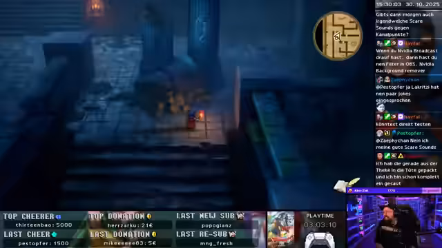 02:36:02Setzt die Jagd nach dem Diebesschlüssel fort, diesmal zusammen mit dem grünen Rächer. Besucht die Galens Ruhestätte, die von verfluchten Gegnern bevölkert wird, die Mana drainieren. Nachdem er die 'Neureiche Weste' und die 'Feenflöte' gefunden hat, reist der Streamer mit dem grünen Rächer zurück, der ihm den versprochenen Diebesschlüssel überreicht.