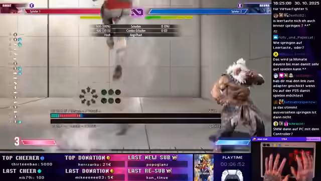 06:50:12Fehlende Drive-Ressourcen machen das Spielen gegen starke Gegner wie Rashid extrem schwierig und führen zu Stuns und Blockschaden. Es kommt häufig vor, dass Kombos gedroppt werden, was zu frustrierenden Situationen und verlorenen Matches führt. Der Streamer gibt den Sieg manchmal unwissentlich aus der Hand, besonders, wenn er sich in der Defensive befindet. Die Steuerung bleibt ein ständiger Störfaktor, besonders Bewegungen nach links und falsch gedrückte Buttons führen zu unnötigen Fehlern.