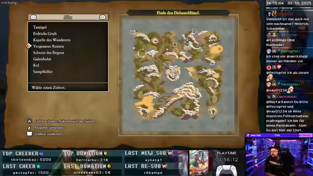02:20:48Reist nach Galenholm, um den Diebesschlüssel zu finden, der jedoch von dem 'grünen Rächer' gestohlen wurde. Nach einem Kampf gegen den Rächer in den Namenlosen Ruinen, bei dem der Streamer Schwierigkeiten mit der Taktik gegen den heilenden Gegner hat, schließt man sich mit diesem jedoch zusammen, da der Rächer offenbar selbst von Erdrick abstammt.