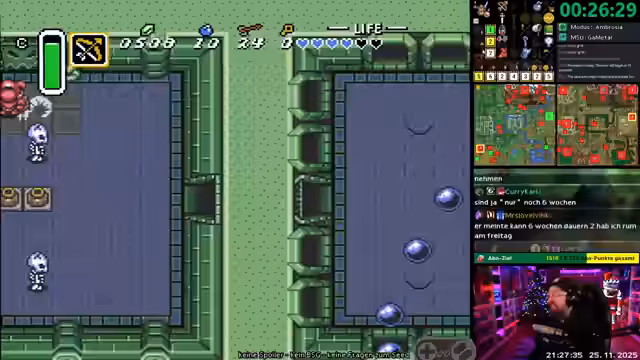 05:19:54Das abendliche Zelda-Rando-Race beginnt mit dem Breath of the Wild Sprite. Es wird eine Wette über ein Herz abgeschlossen, und die Bedeutung von frühen Stiefeln für den Spielfortschritt wird diskutiert. Die Lampe wird als wichtig für die Aga-Logik identifiziert. Die fehlende Stärke erweist sich als großes Problem, da sie das Vorankommen in bestimmten Bereichen behindert. Die Flöte wird als nicht schlecht befunden, aber die fehlende Stärke ist ein großer Nachteil. Es wird über die Möglichkeit gesprochen, alle Dungeons in der aktuellen Welt zu spielen.