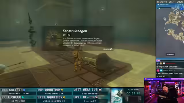 00:59:57Link erwacht und erhält das Pura-Pet, das ihm den Weg weisen soll. Die ersten Fähigkeiten werden erworben, darunter die 'Ultrahand', mit der Objekte bewegt und zusammengefügt werden können. Der Streamer ist begeistert von den Möglichkeiten, die diese Fähigkeit bietet, und plant, alle Krogs und Hauptquests zu sammeln, jedoch nicht jede Nebenquest. Ein Audiolog wird entdeckt, und die verbesserte Performance des Spiels wird hervorgehoben. Im ersten Schrein wird die 'Ultrahand' eingesetzt, um Hindernisse zu überwinden und den Schrein zu meistern. Anschließend wird die Fähigkeit 'Synthese' freigeschaltet, die es ermöglicht, Objekte an Waffen oder Schilde zu befestigen, um deren Eigenschaften zu verbessern. Der Streamer experimentiert mit der Kombination von Gegenständen und ist fasziniert von den neuen Gameplay-Mechaniken. Die Einführung in die Sonau-Bauteile und deren Nutzung wird ebenfalls thematisiert.
