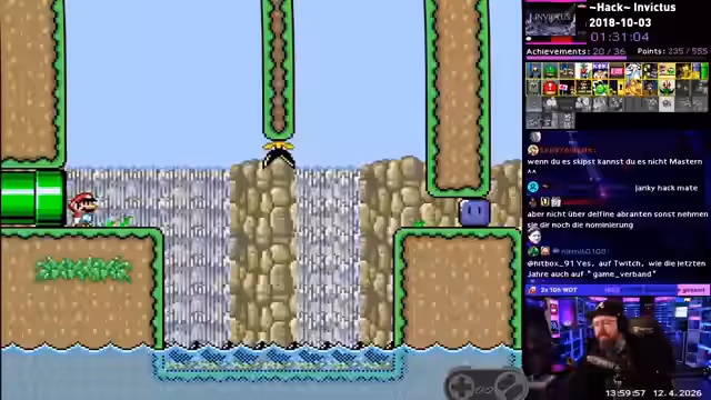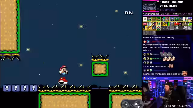 00:00:00Der Stream beginnt mit einem Ohrwurm-Song und der Beschreibung des SMW-Hacks 'Invictus'. Der Streamer stößt schnell auf Frustration, als er versehentlich ein Item im Spiel verliert, was er als 'Gameplay' bezeichnet. Ein technisches Problem mit dem Mikrofon wird behoben und ein neuer Controller mit weichen Sticks wird vorgestellt, als der beste Controller gelobt. Das Spiel 'Line Rider' wird kurz angespielt und zeigt den kreativen Ansatz des Streamers. Ein Geburtstag wird erwähnt und der Streamer plant, nach dem Stream den Mario-Film im Kino zu besuchen.