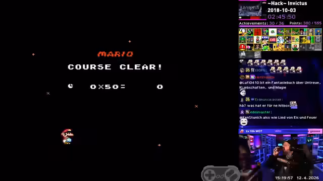 Nachdem der angefangene SMW-Hack 'Invictus' zu Ende gespielt wurde, konnte das Vorhaben, denselben zu 100% zu meistern, erfolgreich abgeschlossen werden. Zuletzt gab es den finalen Versuch, die letzten, als schlimmsten Teil aller Zeiten beschriebenen Level zu absolvieren. Der Streamer gab zwar ein letztes Mal auf, wurde aber durch Zufall fündig und holte sich die letzte fehlende Trophäe.
