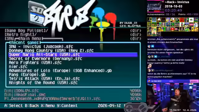 04:18:34Nach Abschluss von Invictus beginnt der Streamer, über seine zukünftigen Pläne für die Retro Achievements zu sprechen. Er möchte unter anderem Knights of the Round und Arrowfighter mastern, sowie Donkey Kong Country mit einer neuen Version des Tools spielen. Auch Grampu World 2 und 3 sind angedacht. Zudem denkt er über ein Mario Kart Multiplayer-Spielen nach, bei dem er im Discord die Teilnehmer für den kommenden DLC sucht, um eine unterhaltsame Session zu gestalten.
