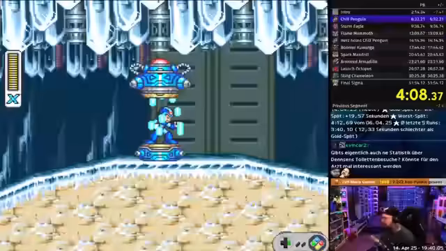 02:39:46Der Anfang des Mega Man X-Runs gestaltet sich für den Streamer äußerst schwierig. Er verliert in den ersten Stages häufig Leben und hat Probleme mit den unklaren Spawn-Logiken für Power-Ups wie das Hadouken. Besonders der Zwischenboss 'Penguin' und dessen komplizierte Attacken-Muster führen zu erheblichem Zeitverlust und Frust, da er sich nach mehreren Versuchen noch nicht sicher in der Bosskampfmechanik fühlt.