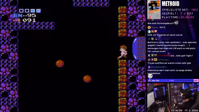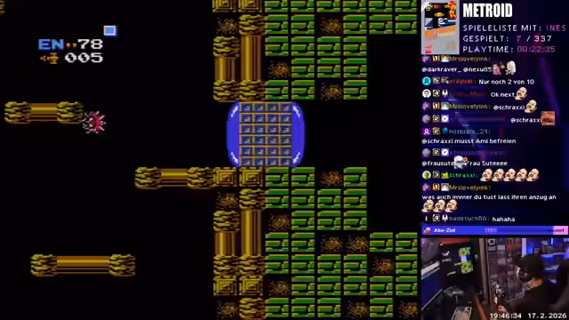 04:14:59Der Streamer beginnt mit dem Spiel Metroid auf Original-Hardware eines NES, was zu deutlichen Performance-Problemen wie Low Frames und Slowdowns führt. Die Orientierung im Spiel gestaltet sich extrem schwierig, da durch den Sparmechanismus des Spiels die Level-Räume stark repetitive Kopien sind. Er ist dennoch motiviert, das Spiel durchzuspielen und nutzt eine Karte, um sich in der gigantischen Welt zurechtzufinden.
