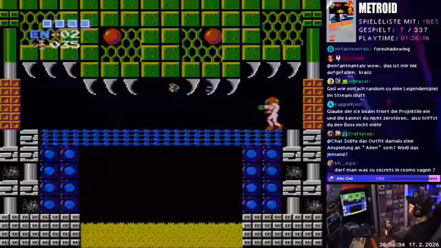 02:25:14Nachdem das Golfspiel beendet ist, wird das nächste Spiel gezogen: Metroid für das NES. Der Streamer drückt seine Begeisterung über das flüssige Gameplay und die ansprechende Grafik aus. Er bemerkt, dass sich sein Charakter nicht ducken kann, was ungewöhnlich für das Spiel ist. Statt einer Karte zu verwenden, beschließt er, das Spiel systematisch zu erkunden, indem er Turm für Turm durchquert und sich Wege merkt, um voranzukommen.