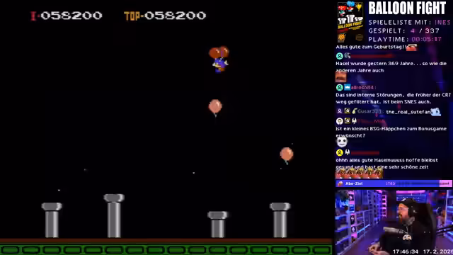 00:37:28Das erste gezogene NES-Spiel ist 'Balloon Fight'. Nach einer kurzen Erklärung der ungewöhnlichen Steuerung, bei der Flattern und gleichzeitig gedrückt werden muss, beginnt der Streamer zu spielen. Das Spiel wird als 'absolutes Classic' bezeichnet, obwohl die Steuerung als holprig und das Gameplay schnell als beendet empfunden wird. Nach 12 Minuten beendet der Streamer das Spiel und gibt seine persönliche Bewertung mit einer 5 ab, da er es für mittelmäßig hält und den Kultfaktor als nicht ausreichend für ein höheres Rating empfindet.