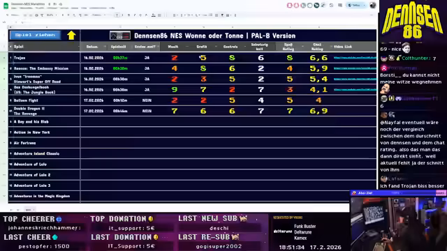 Ein Abend voller NES-Retro-Spiele stand auf dem Programm. Mit Hilfe eines neu eingeführten Tools konnten Zuschauer die Titel bewerten. Die Ergebnisse reichten von hohen bis zu sehr niedrigen Punktzahlen und wurden in einer internen Liste festgehalten. Abschließend wurden zukünftige Formate und Streams angekündigt.