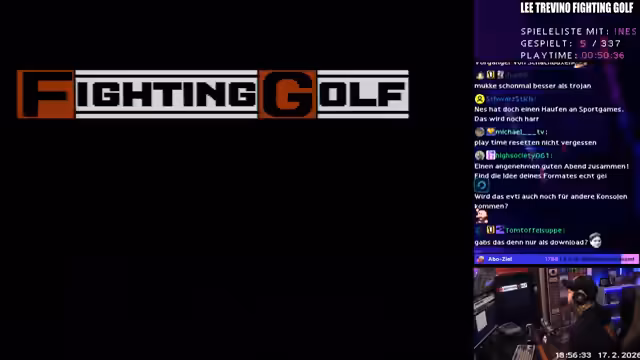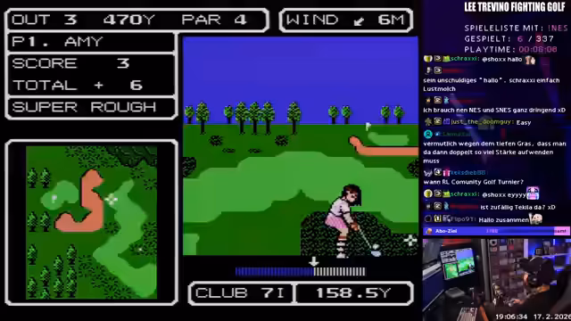 01:59:17Der Stream wechselt abrupt zum nächsten Spiel, dem NES-Titel Trevino Fighting Golf. Der Streamer hat Schwierigkeiten, das Spielstart-Menü zu navigieren, und wählt zunächst den Charakter 'Pretty Amy' aus. Nachdem er sich für die USA als Startort entschieden hat, beginnt er das erste Loch im Stroke-Play-Modus. Die Steuerung wird als verwirrend beschrieben, da das Drücken bestimmter Tasten zum Auswählen des Schlägers und zur Bestimmung der Schlagkraft erforderlich ist, was die Einarbeitung kompliziert macht.