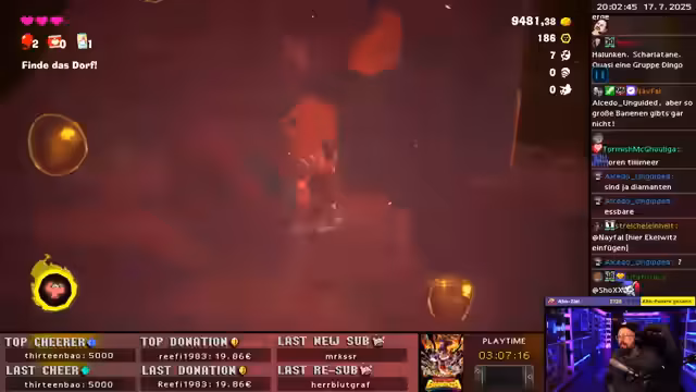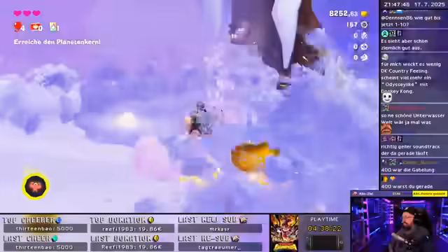 02:39:43Eine neue Bedrohung, ein mysteriöses hartes Terrain, hat einen Schacht blockiert und die Bewohner eingeschlossen. Der Streamer wird gebeten, dieses Terrain zu entfernen, um den Weg in die tieferen Schichten freizumachen. Er erfährt von dem Ziel, den Planetenkern zu erreichen, um die Wünsche der Bewohner, darunter die Rückkehr der Bananen, zu erfüllen. Neben der Haupthandlung entdeckt er Unterschlupfe, in denen er schlafen und Bonushärzen erhalten kann. Die Motivation für das Sammeln bleibt hoch.