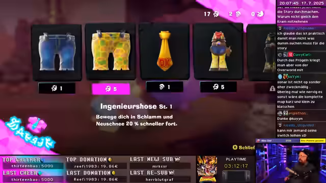 03:14:20Nach dem Sammeln von Ressourcen betritt der Streamer einen sogenannten Style Shop. Hier kann er verschiedene Outfits und Upgrades erwerben, die ihm taktische Vorteile verschaffen. Dazu gehören z.B. eine 20% schnellere Bewegung in Schlamm und Neuschnee oder eine 25% schnellere Banana-Energie-Regeneration. Diese Verbesserungen machen das Sammeln effizienter und motivieren weiter, um mehr Geld zu verdienen und noch stärkere Upgrades freizuschalten.