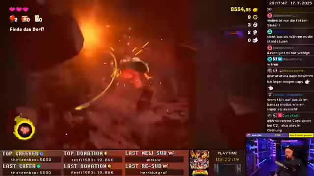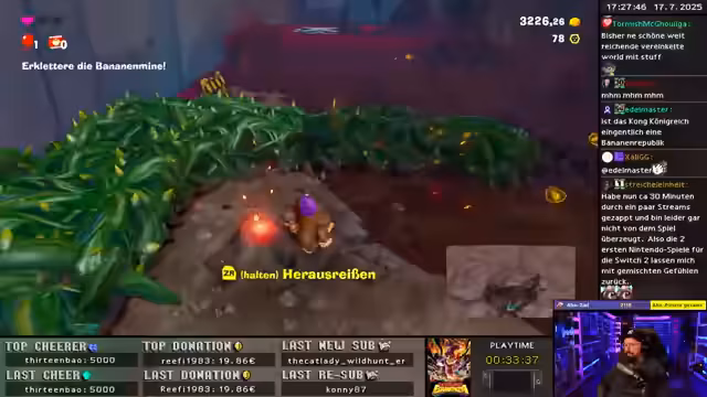 03:01:47Der Stream beginnt mit der Auseinandersetzung des Streamers mit dem Spiel Donkey Kong. Er äußert sich zunächst enttäuscht, fühlt sich aber schnell in das Gameplay hinein und betont, wie geil das Spiel sei. Besonders positiv hebt er die Mechanik hervor, je länger man spielt und mehr Terrain zerstört, desto mehr Truhen spawnen und liefern wertvolle Hinweise, um den Fortschritt zu verfolgen. Dies schafft einen motivierenden Kreislauf aus Erkundung und Belohnung.