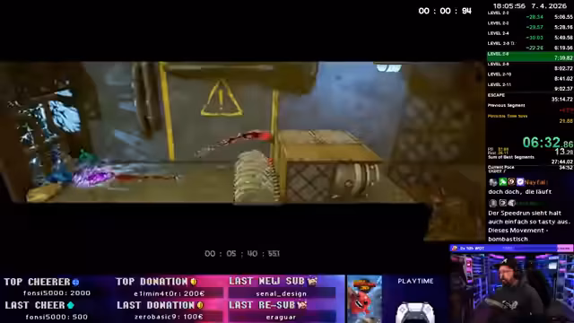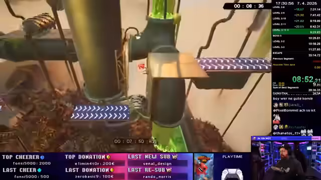 01:01:07Nach mehreren erfolglosen Versuchen startet der Streamer einen vollständigen Speedrun. Der Run beginnt mit einer Overworld, die aufgrund eines Bugs eine Verzögerung verursacht. Die ersten Level werden sicher absolviert, jedoch scheitert der Run am zweiten Boss. Ein unvorhergesehener Treffer kostet wertvolle Sekunden und führt zu einem Tod. Der Streamer zeigt sich frustriert, betont aber, dass dies Übung ist. Der Run endet bei Game Time 32,30.