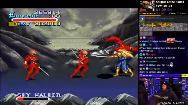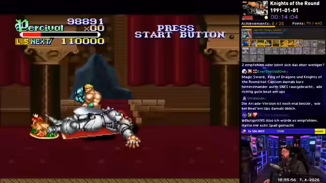 05:29:53Nach den gescheiterten Versuchen mit 'Knights of the Round' wechselt der Streamer zu 'Aero Fighters'. Er merkt sofort, dass das Spiel im Singleplayer-Modus, den er auf 'Hard' spielt, deutlich schwieriger ist als im Multiplayer. Sammelziele wie das Ansammeln von Bomben sind eine zusätzliche Herausforderung. Trotzdem gefällt ihm das Genre und der Spannungsbogen, auch wenn der Druck durch die wenigen Leben hoch ist.