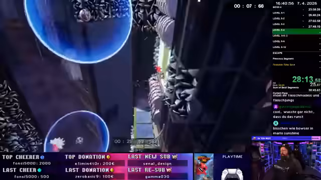 01:56:40Nach einer Pause wird der Fokus auf die letzten und schwierigsten Level gelegt. Die Schwierigkeiten liegen in präzisem Timing und der Vermeidung von Fallen. Level 5-1 erfordert das genaue Ausweichen eines Grinders, während andere Level wie 4-1 und 4-10 das Warten auf unvorhersehbare Zyklen erfordern. Der Streamer testet verschiedene Routinen, um Zeit zu sparen, und betont, dass er für einen Top-10-Run alle Level sicher beherrschen muss.