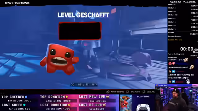 00:00:00Der Stream beginnt mit einer anfänglichen Unterhaltung. Anschließend wird der Fokus auf den bevorstehenden Super Meat Boy 3D Speedrun Any% gelegt, der mit einem SNES-Controller durchgeführt wird. Streamer Dinsen erwähnt seine aktuelle Bock auf Speedruns und stellt sein Ziel vor, eine Sub-30-Zeit zu erreichen. Der Streamer kündigt an, die Bosse als größten Zeitfresser zu identifizieren und Strategien für diese zu entwickeln. Auch die Teilnahme an einer Retro Achievements Endy-Race mit 13 Teilnehmern wird erwähnt.