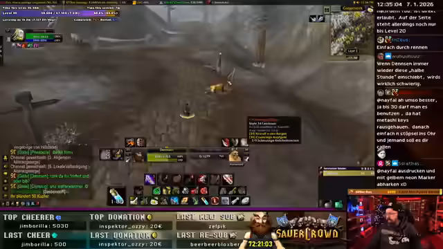 00:24:55Der Streamer diskutiert Level-Strategien für Arathi Highlands und Probleme mit der Gilde. Es fehlen Tanks und Gruppen für Instanzen, obwohl 57 Leute online sind. Der Plan ist, mit Klim Desolace zu erkunden. Kritik am Gebiet Arathi als 'Fake' mit Bait-Quests wird geäußert. Mounts werden als Game Changer für Stimmung und Effizienz beschrieben, wobei der Robo-Schreiter als bestes Mount gefeiert wird.