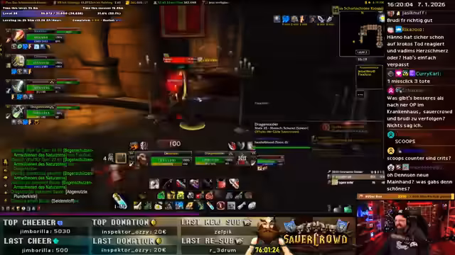 06:30:47Nach intensiven Trash-Kämpfen konzentriert sich die Gruppe auf Boss-Engagements mit Fokus auf Schadensverteilung und Überlebensmechaniken. Der Streamer warnt vor AoE-Gefahren und koordiniert Positionierungen, während die Gruppe über Heilungs-Rang-Optimierung und Debuff-Management diskutiert. Humorvolle Momente mit Gruppenmitgliedern entstehen, während gemeinsam entschieden wird, Kisten zu öffnen und nach Truhen zu suchen.
