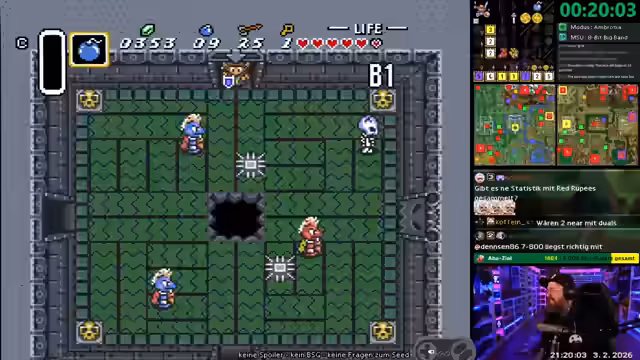 04:03:37Nach dem Abschluss des Dragon Quest 7-Abschnitts wechselt der Streamer zu einem Zelda: A Link to the Past Race. Er spielt den Vanilla-Modus mit dem Redrawn-Link. Der Streamer zeigt Routenoptimierungen, erklärt Mechaniken wie den Sterlek-Cancel und reagiert auf unglückliche Ereignisse wie einen unnötigen Tod im Bosskampf, den er auf Dummheit und nicht auf Pech schiebt. Trotzdem wird der Rennverlust mit 'keine Rage, alles cool' kommentiert.