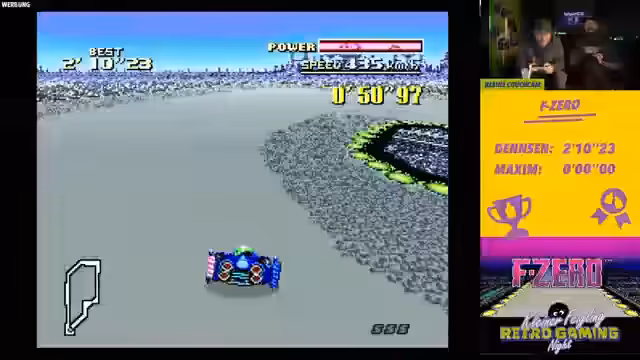 00:46:41Nach dem etwas holprigen Start mit Mario Woods wird das dritte Spiel, F-Zero, vorgestellt. Dies gilt als eines der wichtigsten Spiele des Abends. Nach einer kurzen Diskussion über die Regeln – ob die schnellste Rundenzeit oder die Gesamtzeit gewertet wird und ob man den Boost nutzen darf – entscheiden sich die Streamer für ein freestyle Format. Sie wählen beide den ikonischen Captain Falcon und fahren auf der Strecke Mute City gegen die Uhr. Der Fokus liegt darauf, mit den richtigen Taktiken, wie Driften und Turbonutzung, die schnellste Zeit zu erzielen. Während des Rennens gibt es technische Probleme mit der Darstellung auf dem Bildschirm, was die Anstrengungen der Streamer zusätzlich erschwert. Es ist ein intensives und anspruchsvolles Rennen, das volle Konzentration erfordert.