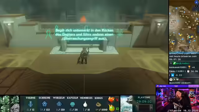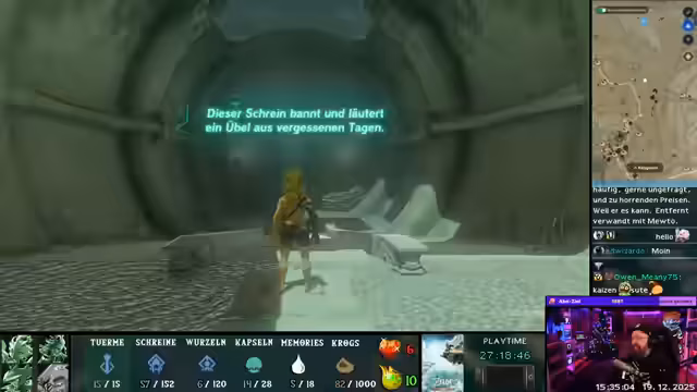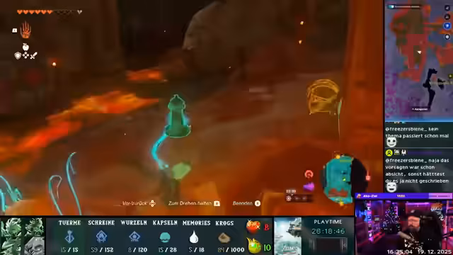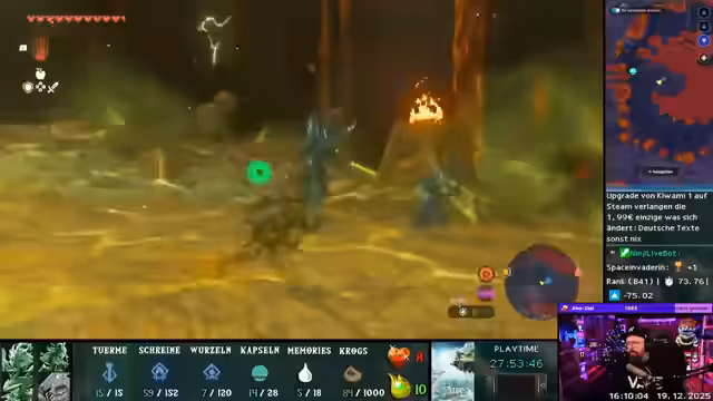 00:00:00Der Stream startet mit dem Zelda: Tears of the Kingdom 100% Run. Der Spieler erkundet die Umgebung, interagiert mit NPCs und kämpft gegen Gegner. Er diskutiert Spielmechaniken wie das Kombinieren von Gegenständen und die Nutzung von Fähigkeiten. Besonderes Augenmerk liegt auf dem Feuer-Dungeon und der Beschaffung feuerfester Ausrüstung. Der Spieler äußert sich begeistert über die Fortschritte im Vergleich zu Breath of the Wild und plant langfristig einen Supercut beider Spiele für YouTube.