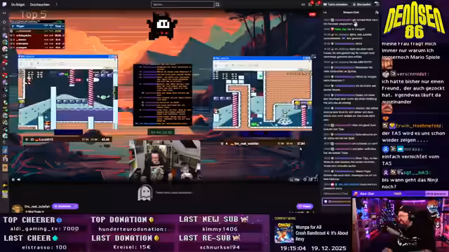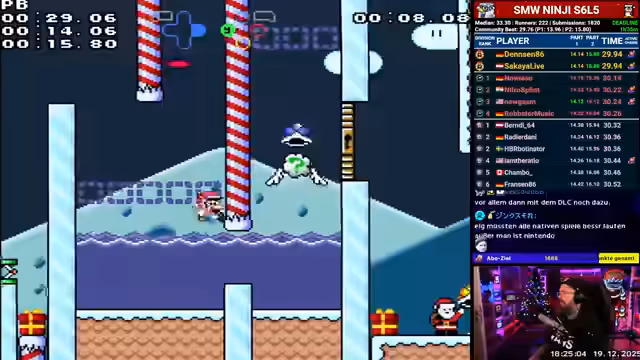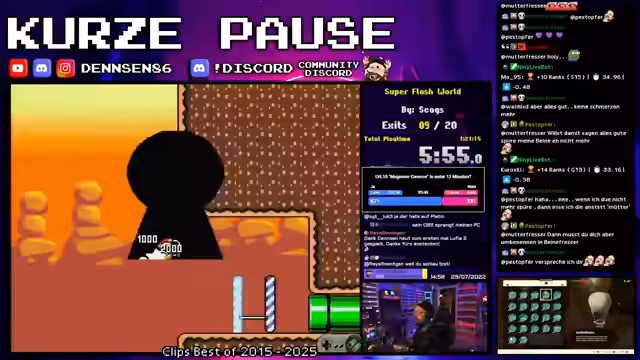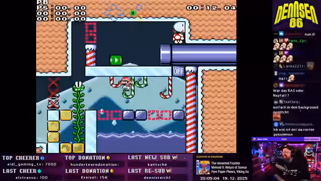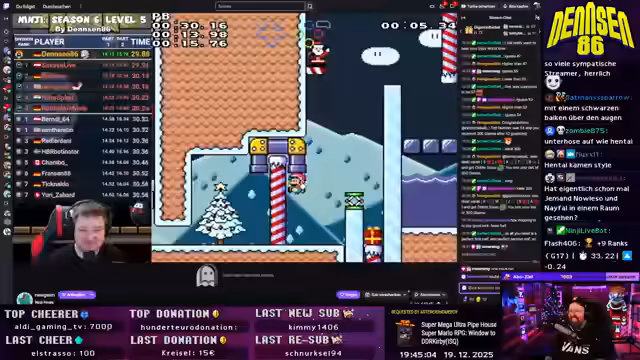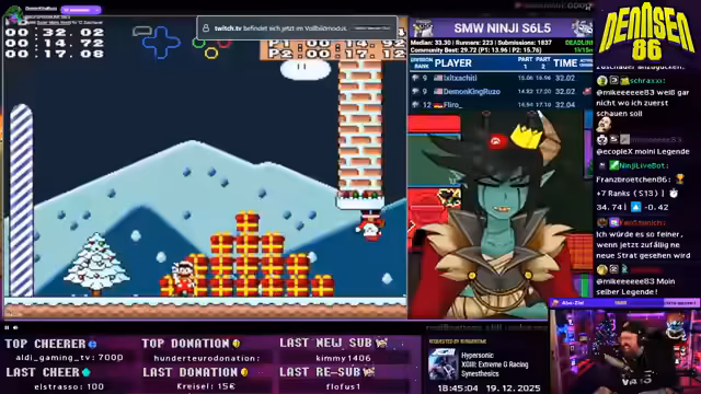 04:24:10Der Stream fokussiert sich auf den Ninji-Event in Super Mario World, bei dem Teilnehmer ihre Bestzeiten verbessern. Spieler wie Claudius und ein Paar aus Holland ziehen besondere Aufmerksamkeit auf sich. Das Paar spielt gemeinsam Ninji und schafft eine gemütliche Freitagabend-Atmosphäre, die von der Community als sehr sympathisch empfunden wird. Es wird diskutiert, wie verschiedene Spieler mit schwierigen Levelabschnitten umgehen, insbesondere mit den berüchtigten Wein-Block-Mechaniken. Internationale Teilnehmer aus Ländern wie Holland und spezielle Controller-Einstellungen werden thematisiert.