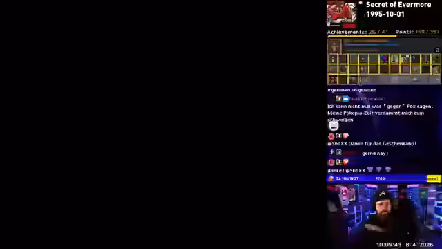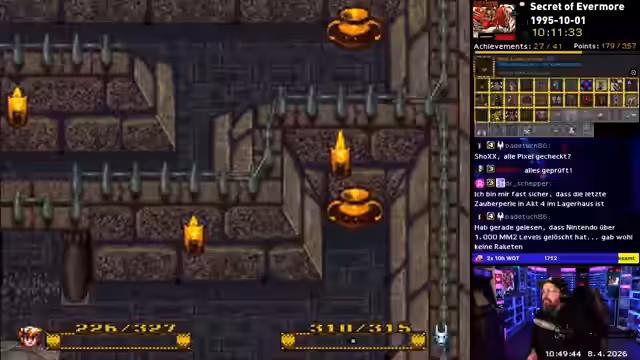 00:21:38Dinsen geht auf seine Ziele für einen 100%-Spielfortschritt ein. Er möchte jedes Spiel zu Ende spielen, das er begonnen hat und hat daher auch Off-Stream weitergespielt. Sein aktuelles Ziel ist es, 'Secret of Evermore' zu 100% abzuschließen, weshalb er verpasste Trophäen wie den Sieg über den geheimen Boss 'Face' in 'Omnitopia' sucht und alle Ausrüstungsgegenstände finden will.