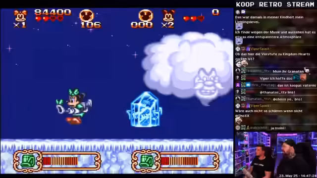 00:28:17Die Streamer beginnen mit Mickey Mouse und stellen fest, dass das Spiel trotz einfacher Optik gut für Koop geeignet ist. Sie erleben technische Herausforderungen wie Input-Lag und Soundprobleme, die sie jedoch als beherrbar einschätzen. Während des Spiels tauchen verschiedene Power-ups und Gegnertypen auf, die sie analysieren und kommentieren, wobei die Herausforderungen des Spiels für zwei Spieler unterschiedlich bewertet werden.