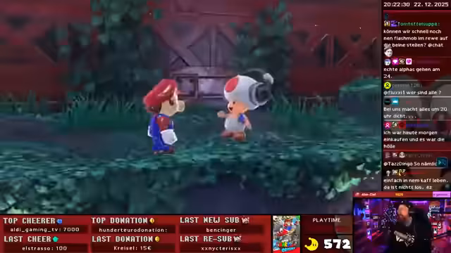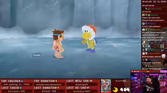01:07:42Gegen Ende des Streams bedankt sich der Streamer bei einem Zuschauer für einen Raid. Er muss kurzzeitig die Tür schließen, da sein Hund bellt, und zeigt sich erleichtert, dass Mario nicht eingefroren ist. Der Stream endet mit der Ankündigung, dass der Weihnachtseinkauf nach dem Stream ansteht, und einem letzten Blick auf die erreichte Mondzahl in Odyssey.