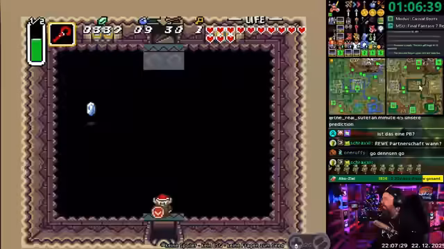 06:10:27Das Race endet erfolgreich mit einem Sieg in Gannon's Tower. Der Streamer findet überraschend Silvers im Final-Chest, was er als glücklich bezeichnet. Er reflektiert über die Seed-Geschwindigkeit und Fehler (z.B. später Hookshot-Fund), betont aber den Spaß am Verlauf. Das Sprite (Nafal als Weihnachtsmann) wird gelobt, und die MSU-Unterstützung für die Musik wird hervorgehoben.