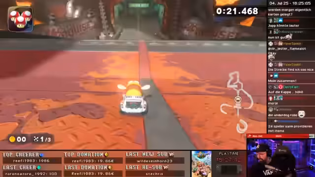 01:58:06Gegen 18 Uhr beginnt die Übergangsphase. Es werden verpasste Clips besprochen und Vorurteile gegenüber Mario Kart World geäußert. Der Streamer trainiert kurz im Timetrial-Modus und sucht nach Shortcuts, fühlt sich aber im Vergleich zu anderen Teilnehmern, die das Spiel bis zu Release-Tag gespielt haben, unterlegen. Der Turnier-Modus, die Teamzugehörigkeiten und die Preisgelder werden kurz vor dem Start vorgestellt.