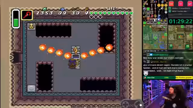 06:18:20Im Verlauf des Zelda-Races findet der Streamer den Spiegel (Mirror), was ihm die weitere Suche nach dem Eisstab erschwert, da nun mehr Dungeons in der Logik geöffnet sind. Er spielt den Crystal Dungeon und erreicht dank seiner Ausrüstung (Hookshot, Feuerstab) die Schatzkammer. Dennoch verpasst er die Chance, ohne Spiegel in den Turtle Rock zu gelangen, was eine potenzielle schnellere Route gewesen wäre. Das Pech wird von ihm und den Chat-Teilern diskutiert.