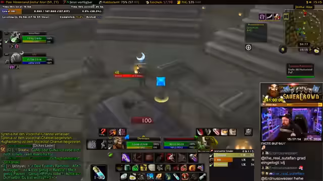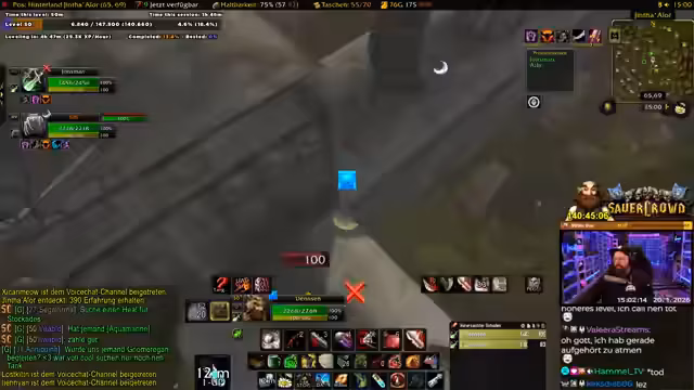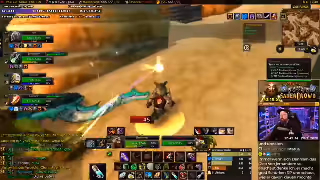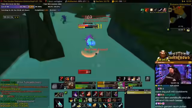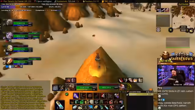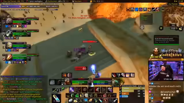 05:02:09Die Gruppe betritt den Dungeon Sulpharag mit dem Ziel, Level 50 zu erreichen. Albi übernimmt die Tank-Rolle. Es werden grundlegende Taktiken besprochen: das Markieren der Mobs als Ziel, die Notwendigkeit, ruhig zu bleiben und nicht zu schreien, sowie das Management von Mobs mit speziellen Fähigkeiten, wie Sandkriechern, die nicht betäubt werden können. Der Streamer stellt seine Heiler-Spec vor und verteilt Buffs, um die Schadensleistung zu erhöhen und die Heilungsanstrengungen zu minimieren.