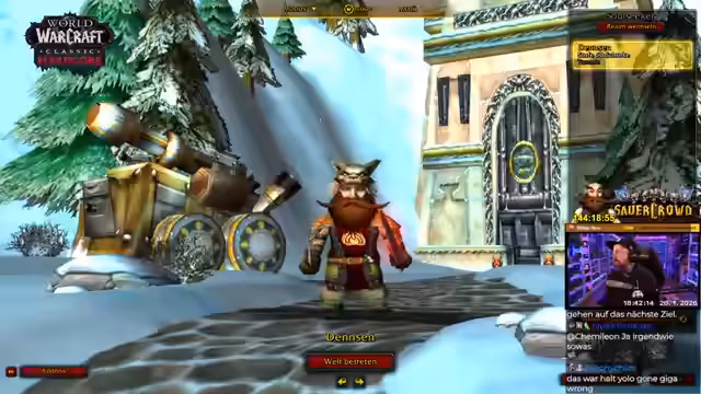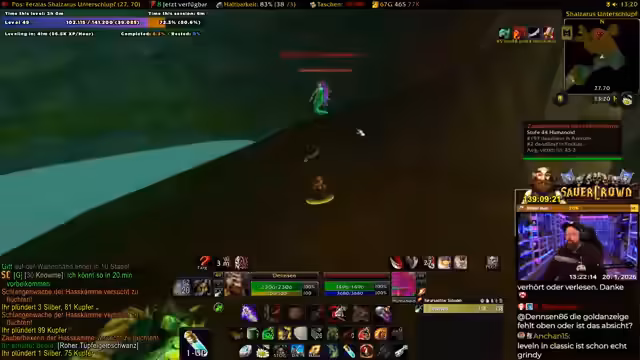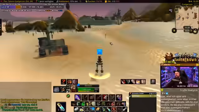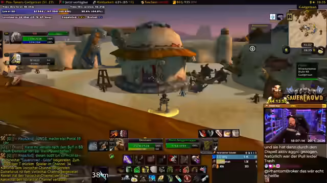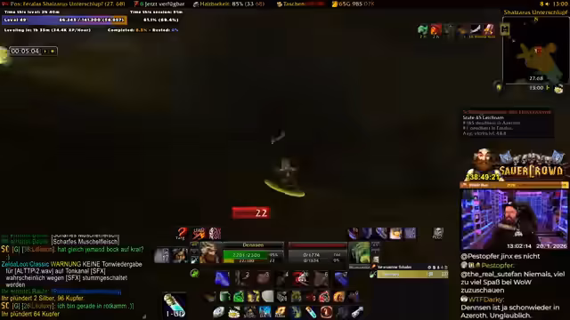 04:50:55Gruppenmitglieder wie Vitablo und Grubby werden nicht rechtzeitig im Spiel angetroffen, was die Gruppenbildung für den Dungeons Sulpharag erschwert. Der Streamer fühlt sich für die Verzögerung verantwortlich und entschuldigt sich. Als Lösung wird überlegt, Vitablo durch Portieren in die Nähe zu bringen, jedoch ist der benötigte Goblinstein derzeit auf Abklingzeit. Dies erfordert einen Umweg, den der Streamer aber in Kauf geben würde, da er keine Items mehr aus dem Dungeon benötigt.