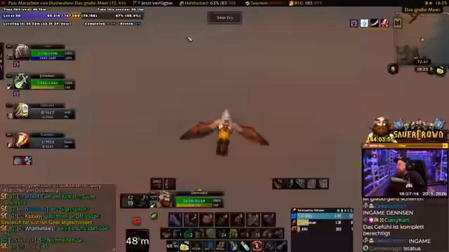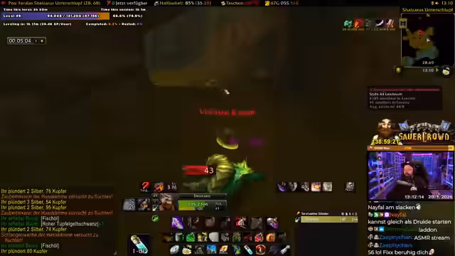 03:59:59Nachdem die Aufgabe abgeschlossen ist, sucht der Streamer nach sinnvollen Aktivitäten für den Level 50. Die Nagerhöhle wird als zu langweilig abgetan, und die Naga-Psychose lohnt sich ebenfalls nicht. Stattdessen werden Quests in Azshara und später in der Sehenden Schlucht als gute Optionen genannt. Es gibt einen AOE-Mage-Grindspot und auch einen als Gelegenheit, Myrodons und Dinos zu farmen. Der Streamer entscheidet sich dafür, nach Feralas zu reisen und dort stumpf zu grinden oder questen zu gehen.