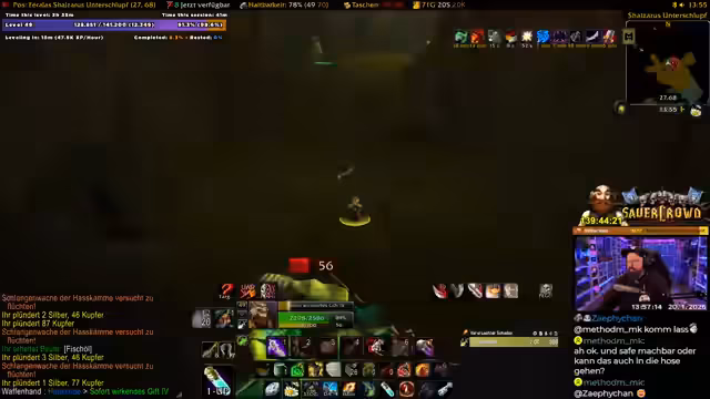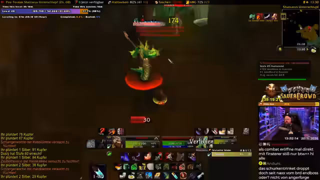 02:08:57Der Streamer setzt sich ein Ziel, bis Donnerstag auf Level 60 zu kommen, was er für realistisch hält, solange er keine Fehler macht. Er sucht nach den besten Farm-Spots am Ende des Levelings und erwähnt Waldarbeiter bei den Menschen. Bei den Instanzen präferiert er Maraudon und den Tempel, aber BRD lehnt er aufgrund des enormen Zeitaufwands für alle Quests ab. Er äußert seine Erwartung am Raid-Ziel, merkt aber an, dass seine Spielzeit und die des Raids nicht mehr synchronisierbar sind.