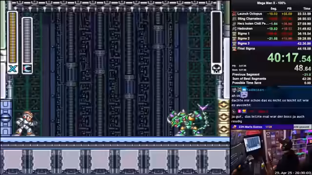 03:45:05Der Stream beginnt mit einem anfänglich guten Lauf in Mega Man X, bei dem der Spieler aktiv nach Gegenständen sucht und auf den Laserdash hinarbeitet. Trotzdem kommt es zu unvorhergesehenen Problemen im späteren Verlauf, insbesondere mit den Endbossen Sigma, die als sehr anspruchsvoll beschrieben werden. Durch mehrere verpasste Treffer und ungeschickte Manöver verliert der Spieler viel Gesundheit, was zum Scheitern des Runs führt. Trotz des unfreiwilligen Endes wird eine persönliche Bestzeit (PB) im Gold-Split erreicht, was als positives Ergebnis gewertet wird, auch wenn die Gesamtzeit durch den Missgeschick nicht optimal war.