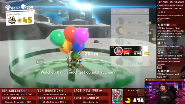 06:09:07Nach dem Sammeln von Outfits und Hüten konzentriert sich der Streamer auf den Münzgrind im Pilzkönigreich. Durch Ballon-Suche und Streak-Boni will er schnell Münzen für finale Käufe sammeln. Gleichzeitig werden Achievements wie 'Ground Pounds' und Gegner-Besitzungen überprüft, um 100% abzuschließen.