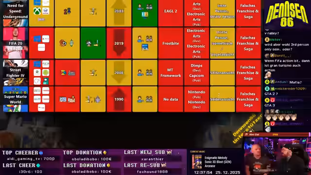 00:44:14Der Streamer spielt ein Mastermind-ähnliches Rätzel, bei dem sie ein Spiel anhand von Kategorien wie Genre, Plattform und Erscheinungsjahr erraten müssen. Sie schlagen Titel wie 'Street Fighter', 'FIFA' und 'Need for Speed' vor, scheitern aber an Details wie dem Action-Aspekt. Langsam schränken sie ein: Es muss ein Rennspiel von 2004 mit Splitscreen und Action-Elementen sein, aber ohne Nintendo-Plattform. Nach vielen Versuchen und Verwirrung über gelbe/grüne Hinweise identifizieren sie 'Gran Turismo 3' oder '4', wobei sie die Perspektiven (First Person, Third Person) diskutieren. Der Streamer lobt die Lizenzen im Spiel und kritisiert dabei die 'langweiligen' Aspekte, findet aber die Seite zum Raten generell 'geil'.